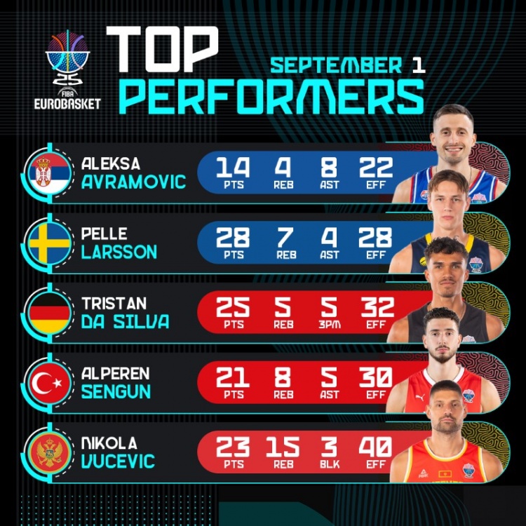 9月2日,男篮欧锦赛新一轮赛事落幕。欧锦赛官方推特今日发布了昨日比赛中的球员精彩数据汇总。