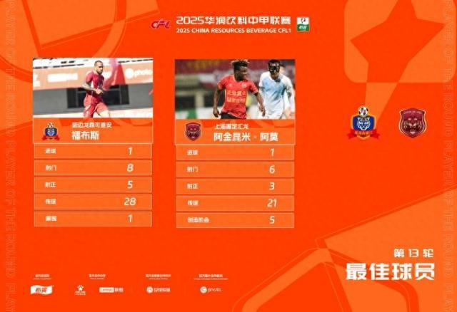 直播吧9月11日讯 中甲第13轮最佳球员奖项公布,延边龙鼎外援福布斯和上海嘉定汇龙外援阿金昆米-阿莫共同当选。